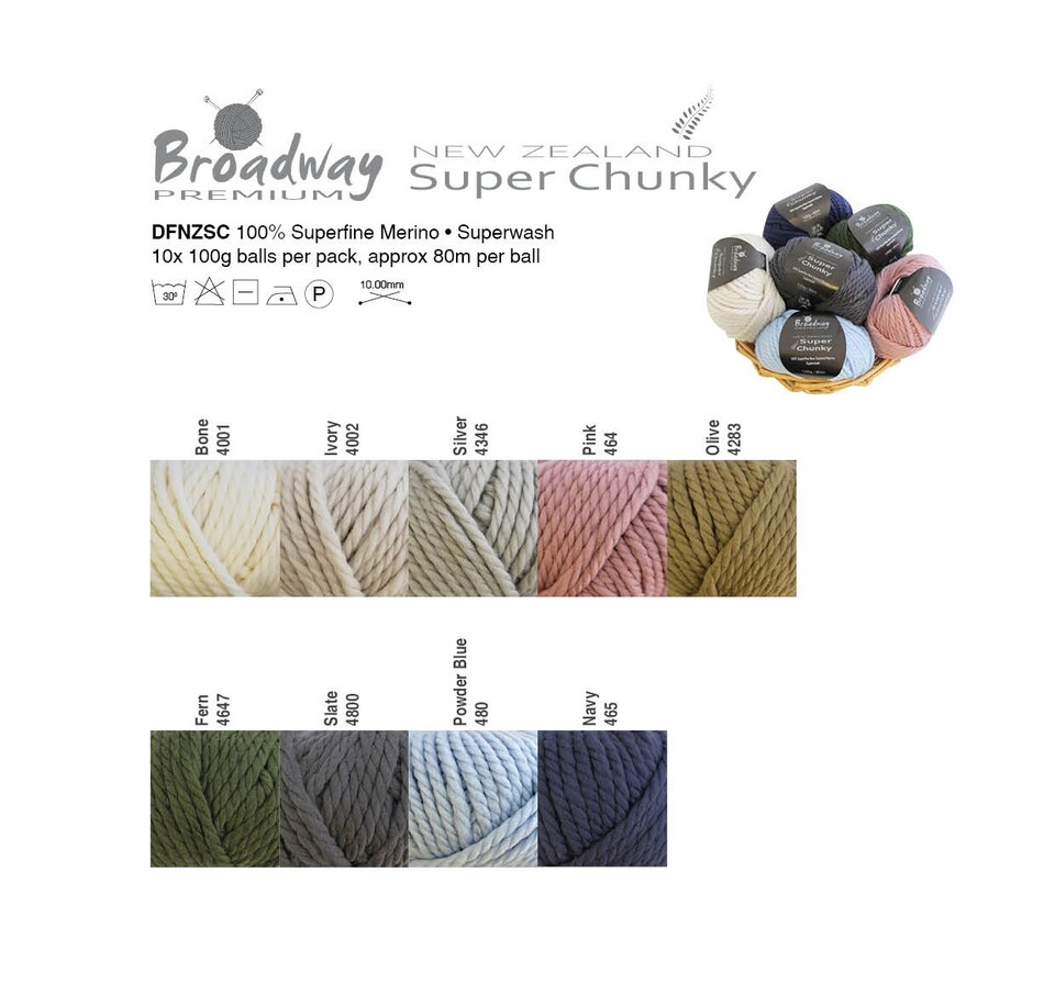 Our Broadway Premium Super Chunky range uses the finest NZ merino in 9 sought after colourways. These superfine Merino yarns have been grown in NZ and are luxuriously soft and durable. Its superwash properties make it suitable for all types of projects.