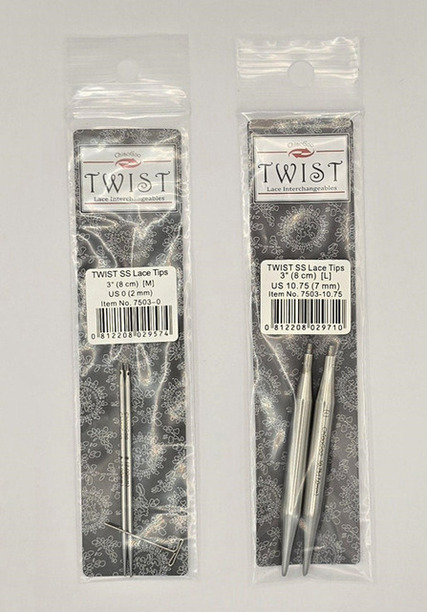 These ChiaoGoo 3″ (8 cm) precisely-machined, lace tips are made of surgical stainless steel. The size is laser imprinted on each tip.