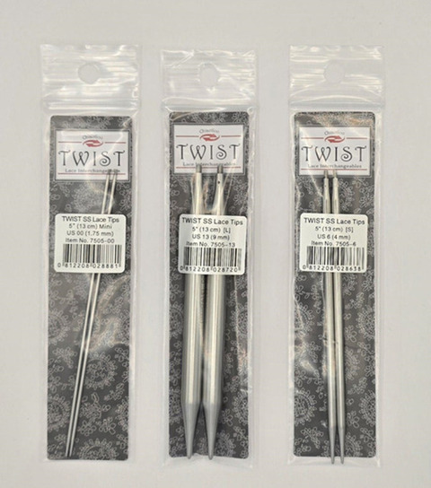 These ChiaoGoo 5″ (13 cm) precisely-machined, lace tips are made of surgical stainless steel. The size is laser imprinted on each tip.  See below stock options for more information.